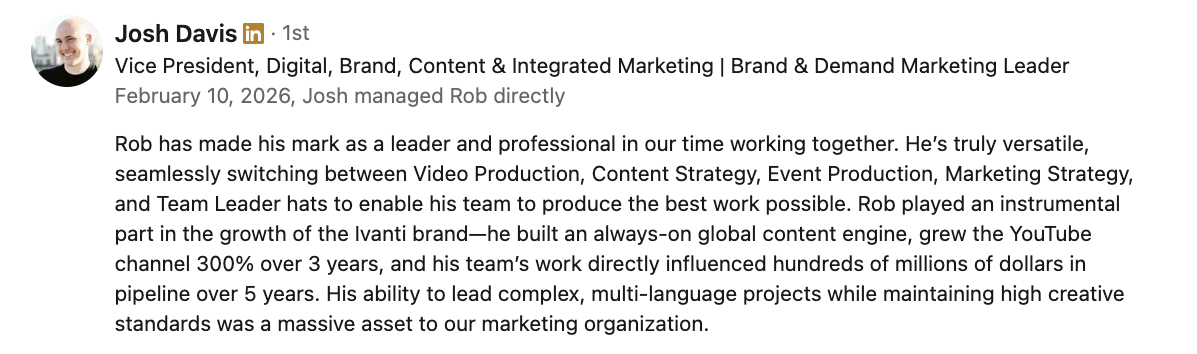 I am passionate about building teams that produce high-quality, data-driven content that drives measurable business results. If you’re interested in transforming your video department into a high-output content powerhouse, let’s connect.